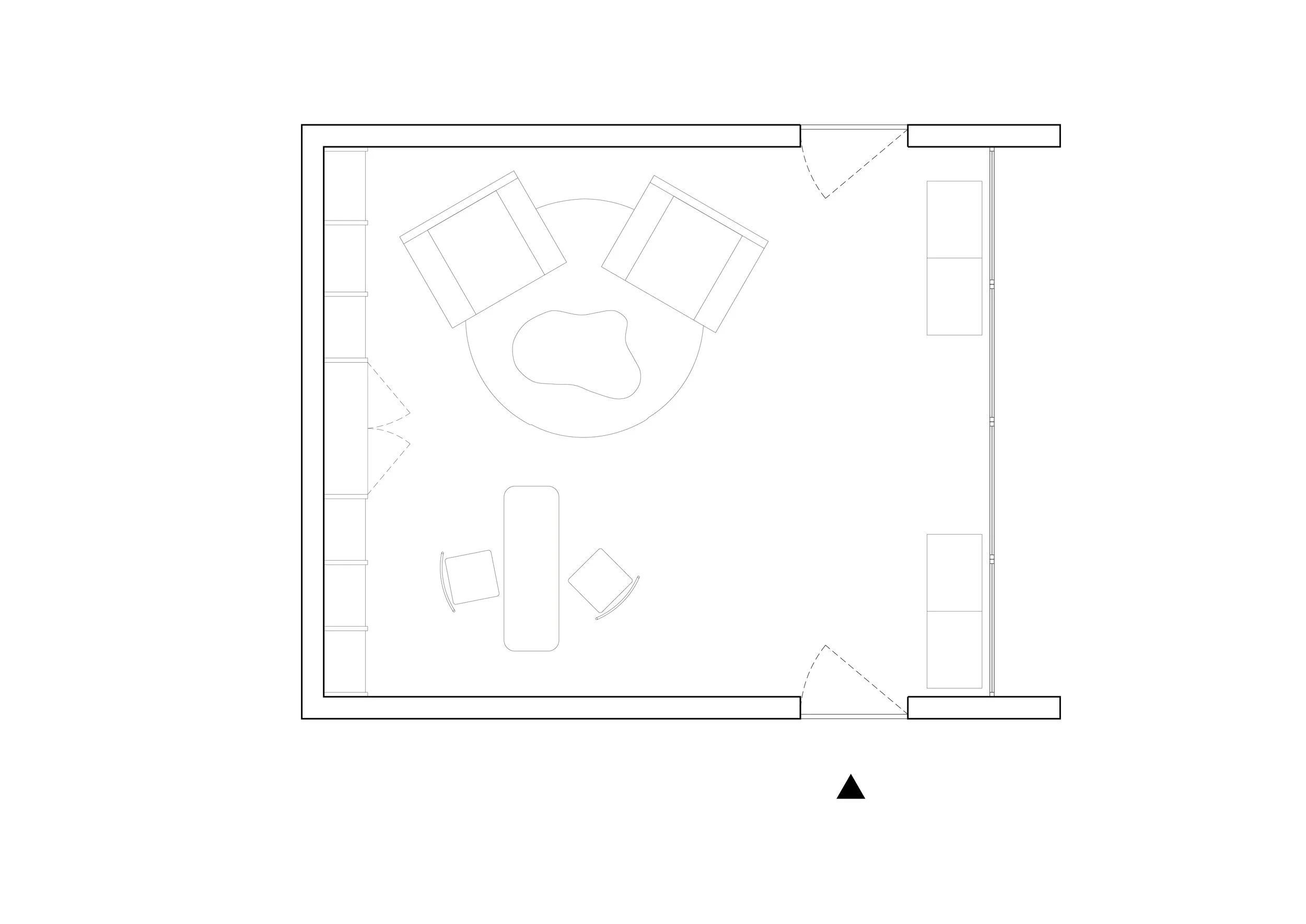 Sanctum is envisioned as a retreat located in Denmark, where architecture becomes the framework for calm, reflection, and connection. The room is not conceived as a clinical enclosure but as a space of stillness, carefully proportioned and layered with material warmth. Its floor plan establishes two distinct but complementary zones: a workspace anchored by a sculptural black desk and shelving, and a softer lounge setting arranged around a circular rug. The organisation is simple, intuitive, and unencumbered, allowing the occupant to shift seamlessly between focus and conversation, structure and ease.